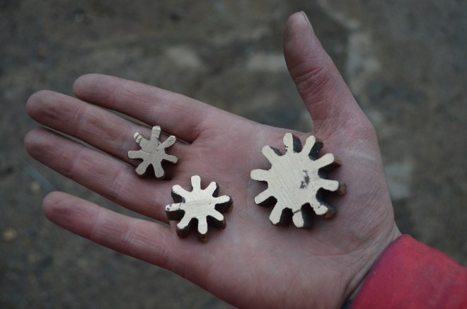 Test 2: I’ve been working on some clockwork pieces for a while, making cogs and pinions in ply, but thought they might be a bit more interesting moved into bronze, at least in some parts of the clockwork. These weren’t very perfect to start with even in ply, and going through an organic burn out process was pretty interesting – directly coating the ply pieces in ceramic shell material before burning out the ply pieces in their entirety.