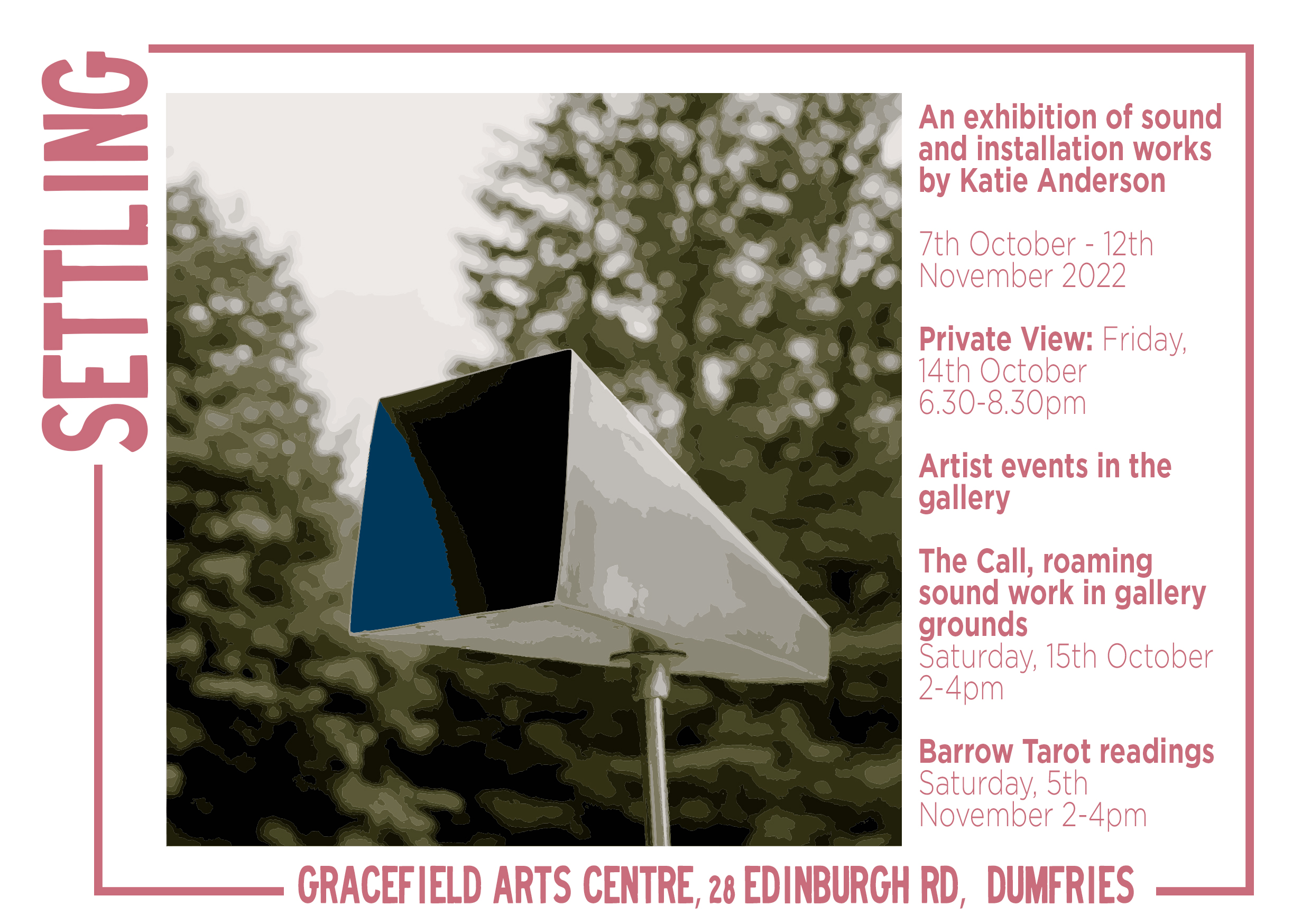 A reflective exhibition bringing together a series of sculptural sound and installation works, many exhibited in a gallery space for the first time. Featuring a pair of environmental sound works re-imagined for the gallery, alongside new audio works and installations exploring place, identity, and environment – the works in Settling invite the audience to take a journey – from the sonic to the imagined.