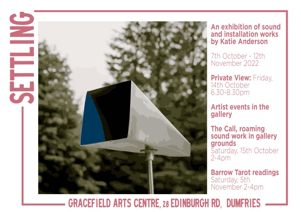 Alongside the exhibition, I will be hosting a couple of ‘active’ days in the gallery beginning with hosting an evening viewing on Friday, 14th October from 6.30-8.30pm. On Saturday 15th October I will be taking The Call, a roaming sound work out in the grounds of Gracefield Arts Centre for a playful afternoon (in the case of terrible weather please get in touch before travelling). And on Saturday, 5th November I will be hosting a drop in Barrow Tarot session – pop by throughout the afternoon and receive your own Barrow Tarot reading.