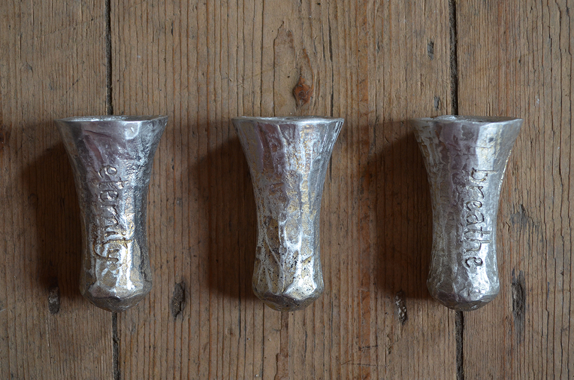 For the project I created a series of pewter cast drining vessels, and sourced a series of vintage torpedo glass bottles. The vessels were designed for communal passing and sharing, without bases to encourage the continued passing on of the objects and to add an element of ceremony and occassion to the sharing of water.