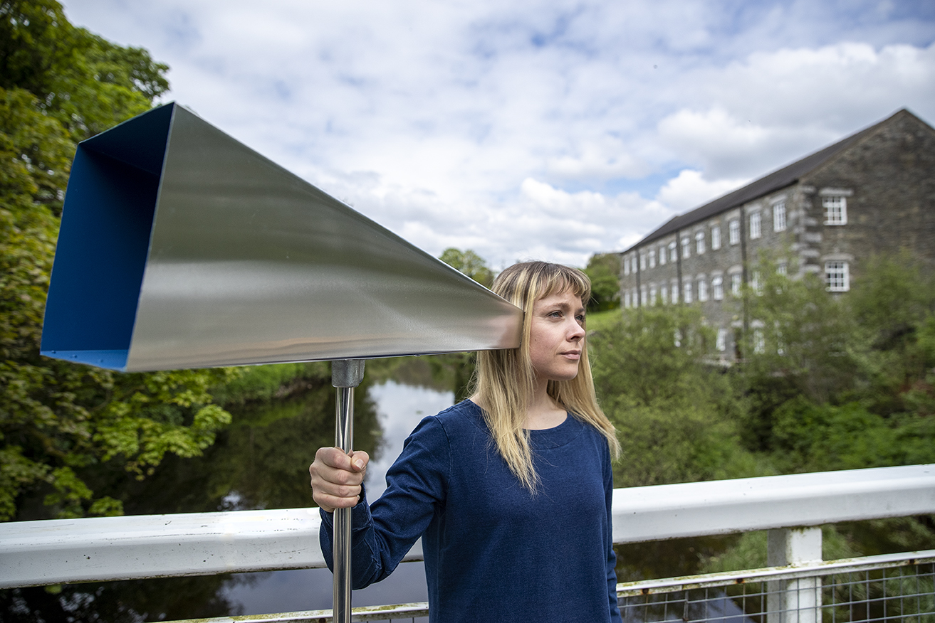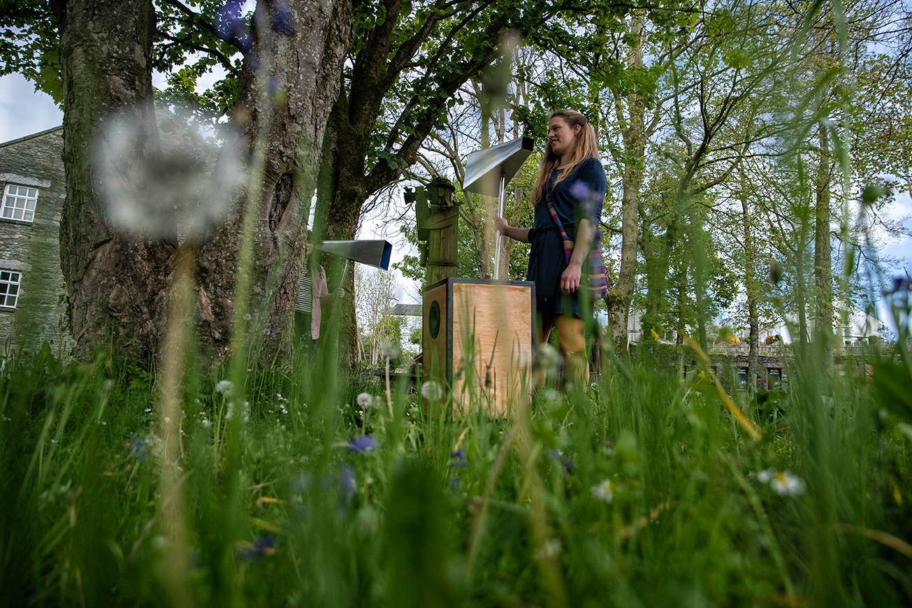 The work is a playful investigation of space through our audible landscapes, and is a roaming artwork ‘performed’ daily during the installation by two sounders, who move the work around the grounds at the Mill on the Fleet emitting a call and response sound composition.